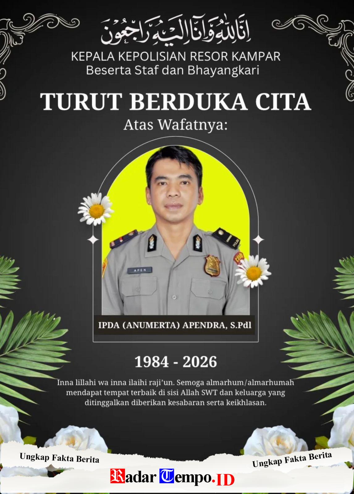 Aiptu Apendra, yang menjabat sebagai Banit Reskrim Polsek Kampar, dinyatakan meninggal dunia pada Sabtu (21/3/2026) sekitar pukul 02.39 WIB, akibat kelelahan dan sesak napas saat bertugas.