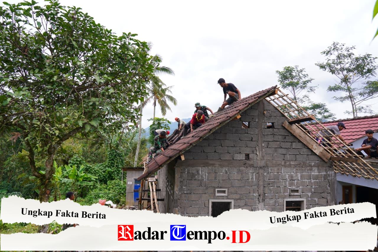 Blitar – Anggota Satgas TMMD Ke-127 Kodim 0808/Blitar bersama warga bahu-membahu memasang genteng/atap dalam program renovasi Rumah Tidak Layak Huni (RTLH) milik Mbah Ayem di Dusun Krisik, Desa Krisik, Kecamatan Gandusari, Kabupaten Blitar, Selasa (24/2/2026). Kegiatan ini dilaksanakan dengan semangat gotong royong demi memastikan rumah yang direnovasi menjadi layak, aman, dan nyaman dihuni.