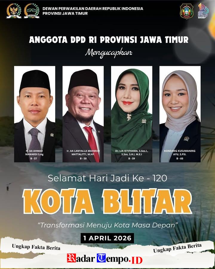 Surabaya – Anggota Dewan Perwakilan Daerah (DPD) RI Provinsi Jawa Timur menyampaikan ucapan selamat Hari Jadi ke-120 Kota Blitar yang diperingati pada 1 April 2026. Ucapan tersebut disampaikan sebagai bentuk apresiasi sekaligus harapan atas kemajuan dan transformasi kota yang dikenal sebagai Kota Proklamator itu.