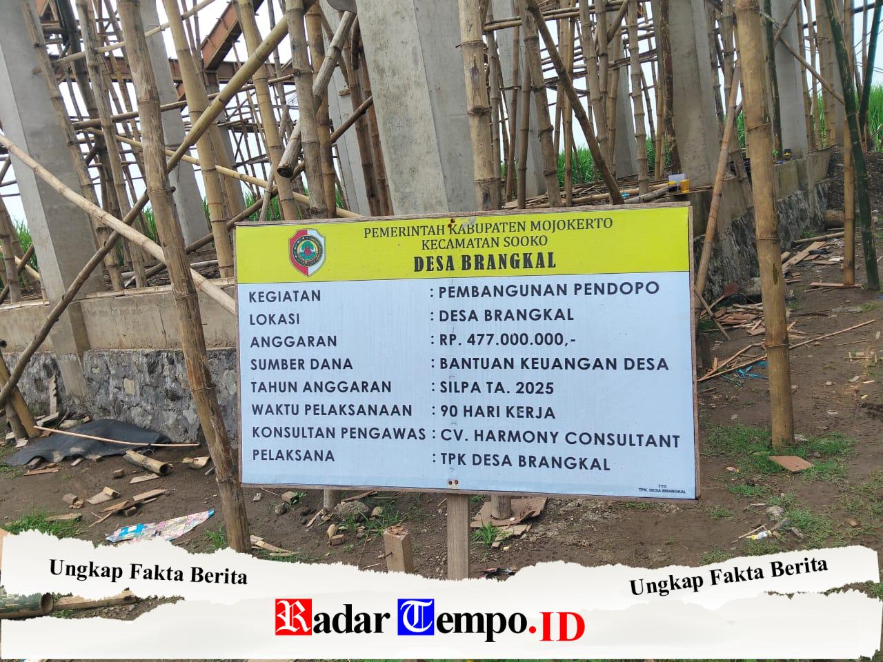 RADARTEMPO.ID MOJOKERTO, – Sebuah proyek pembangunan pendopo di Desa Brangkal, Kecamatan Sooko, Kabupaten Mojokerto, Jawa Timur, menjadi sorotan publik menyusul penggunaan dua material semen yang berbeda dari spesifikasi umum serta adanya selisih harga dalam Rencana Anggaran Biaya (RAB).