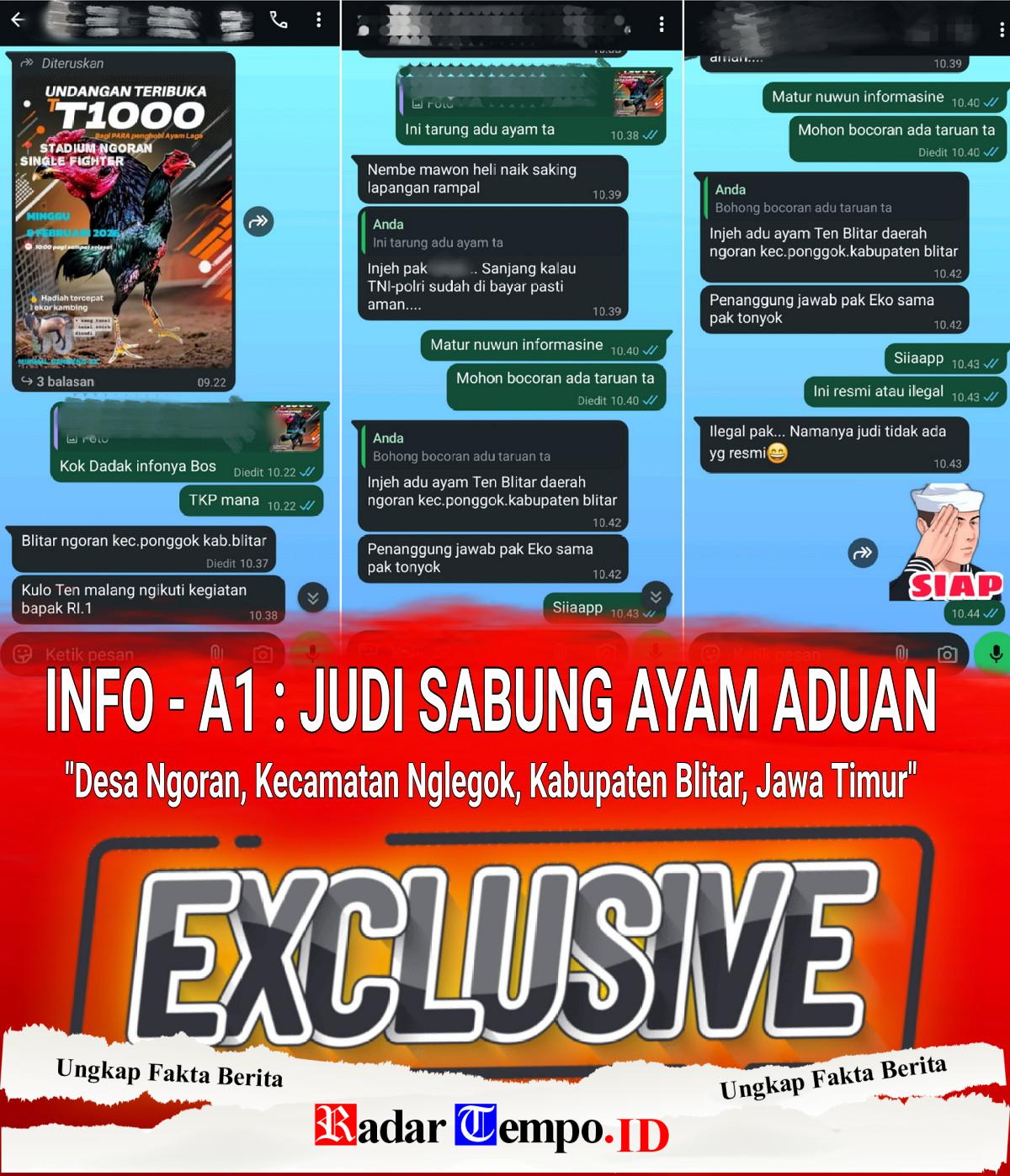 Dari informasi tersebarnya berbagai awak media sekitar Kabupaten Blitar dan Kota, hingga juga tersebar di Group Whatsapp Wartawan Liputan Polda Jatim, sempat terjadi Chat Whatsapp seseorang (narasumber) yang membocorkan agenda “Judi Adu Ayam” Stadion Ngaron, Desa Ngoran, Kecamatan Nglegok, Kabupaten Blitar, Jawa Timur, (Red-nama tidak mau terexpose media).