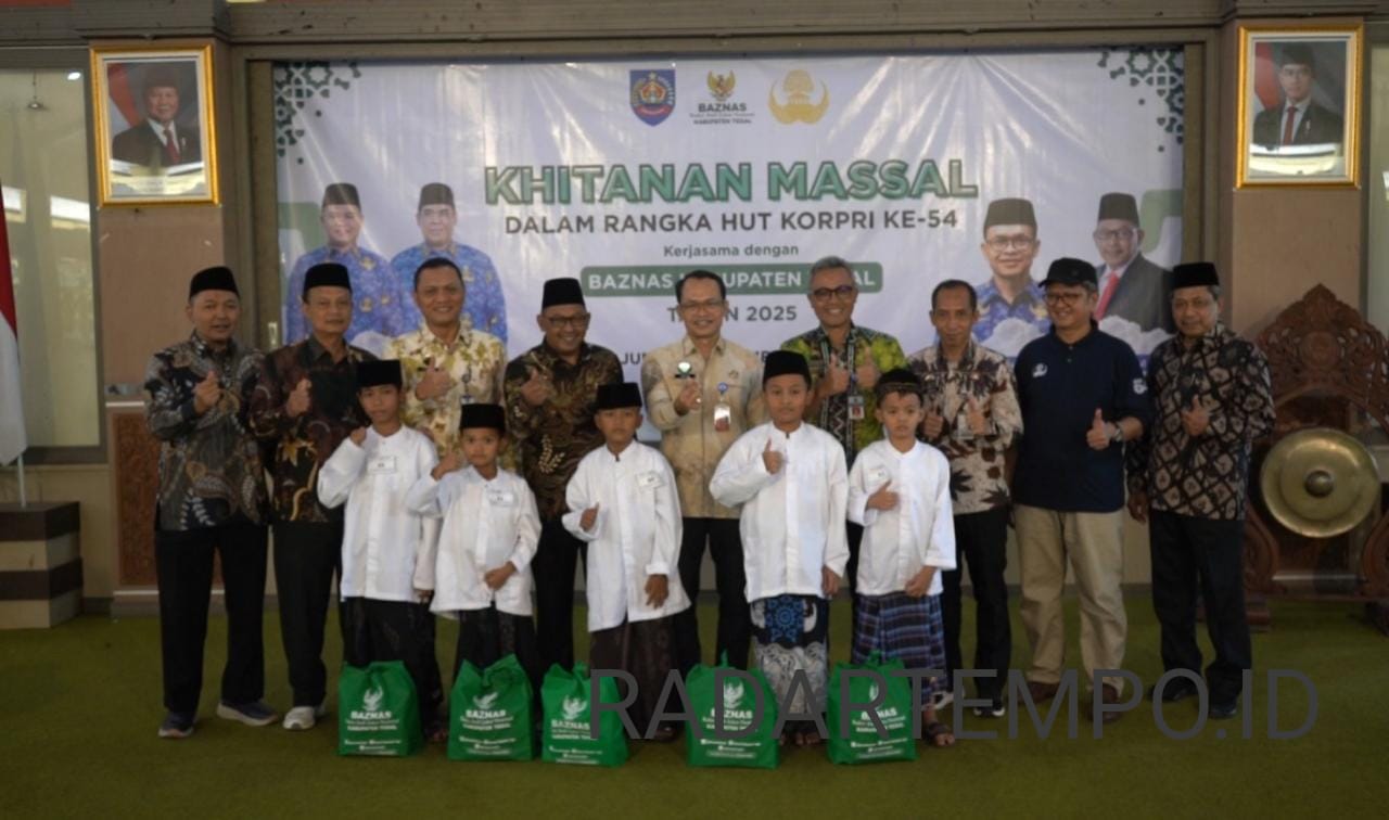 RADARTEMPO.IF Slawi, Suasana Pendopo Amangkurat riuh oleh hiruk-pikuk orang tua di sela-sela tangisan anaknya yang tengah menjalani proses tindakan sunat, Jumat (5/12/2025). Sebanyak 133 anak mengikuti sunatan massal yang menjadi rangkaian peringatan HUT ke-54 Korpri.