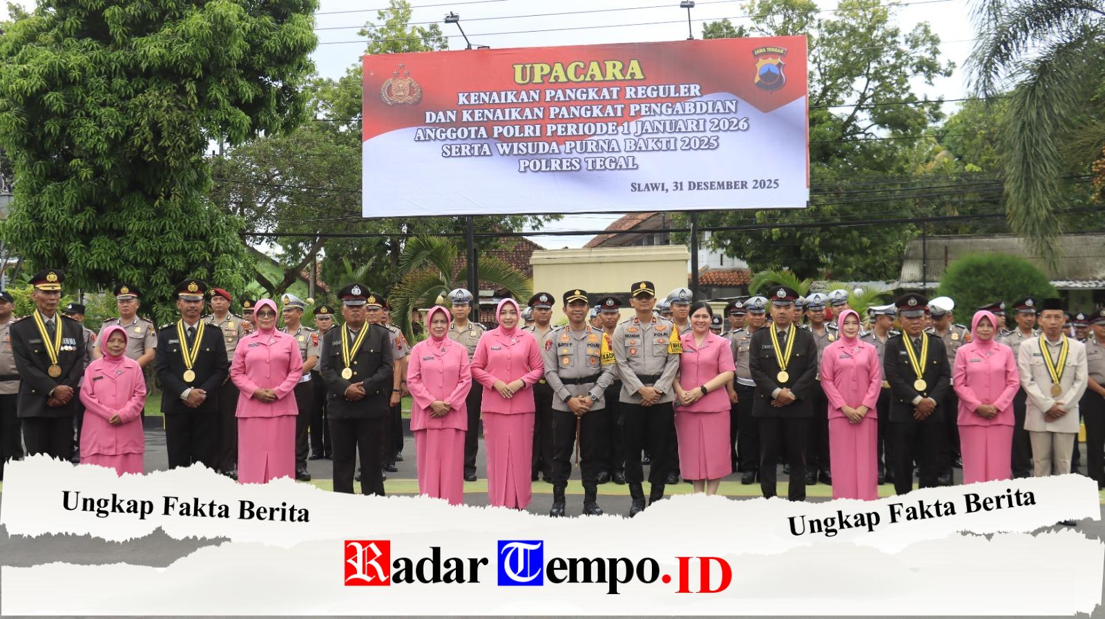 TEGAL, Radartempo.id –Polres Tegal menggelar Upacara Laporan Kenaikan Pangkat Anggota Polri Periode 1 Januari 2026 sekaligus Wisuda Purna Bakti Tahun 2025 di Mapolres Tegal, Kamis (01/01/2026). Kegiatan tersebut berlangsung khidmat dan penuh makna sebagai wujud penghargaan institusi Polri terhadap dedikasi serta pengabdian para anggotanya.