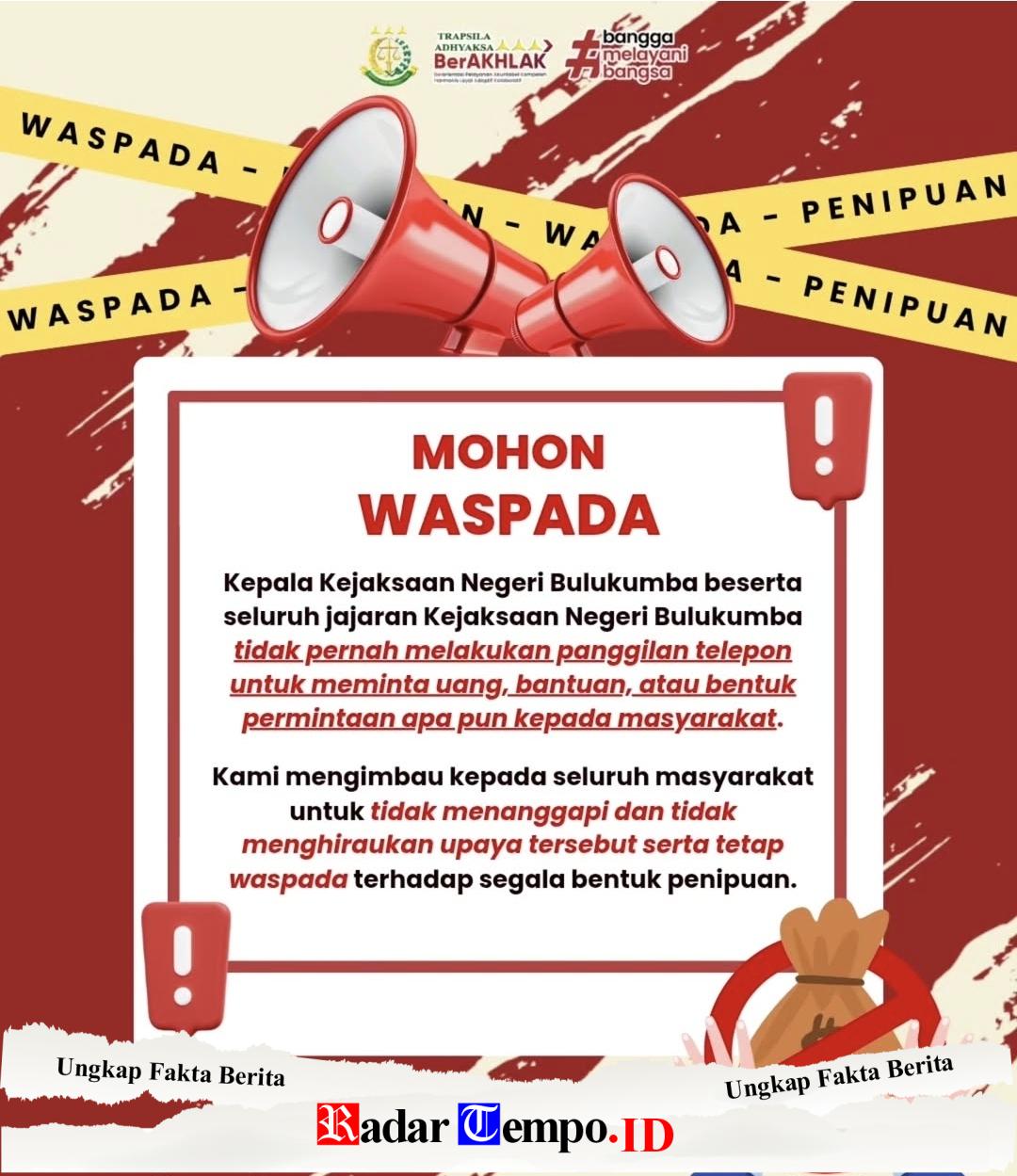 Imbauan ini menjadi bagian dari upaya preventif untuk melindungi masyarakat dari praktik penipuan yang memanfaatkan nama institusi penegak hukum demi keuntungan pribadi.