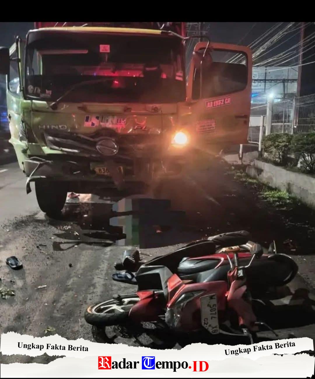 Truk tersebut menabrak bagian belakang sepeda motor hingga korban terdorong ke depan dan menghantam truk wing box yang berhenti di depannya.