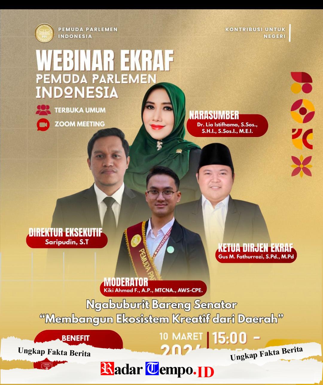 RADARTEMPO.ID Surabaya – Pemuda Parlemen Indonesia akan menggelar kegiatan Webinar Ekonomi Kreatif (Ekraf) yang terbuka untuk umum pada Selasa, 10 Maret 2026 pukul 15.00 WIB melalui Zoom Meeting. Kegiatan ini mengusung tema “Ngabuburit Bareng Senator: Membangun Ekosistem Kreatif dari Daerah.”
