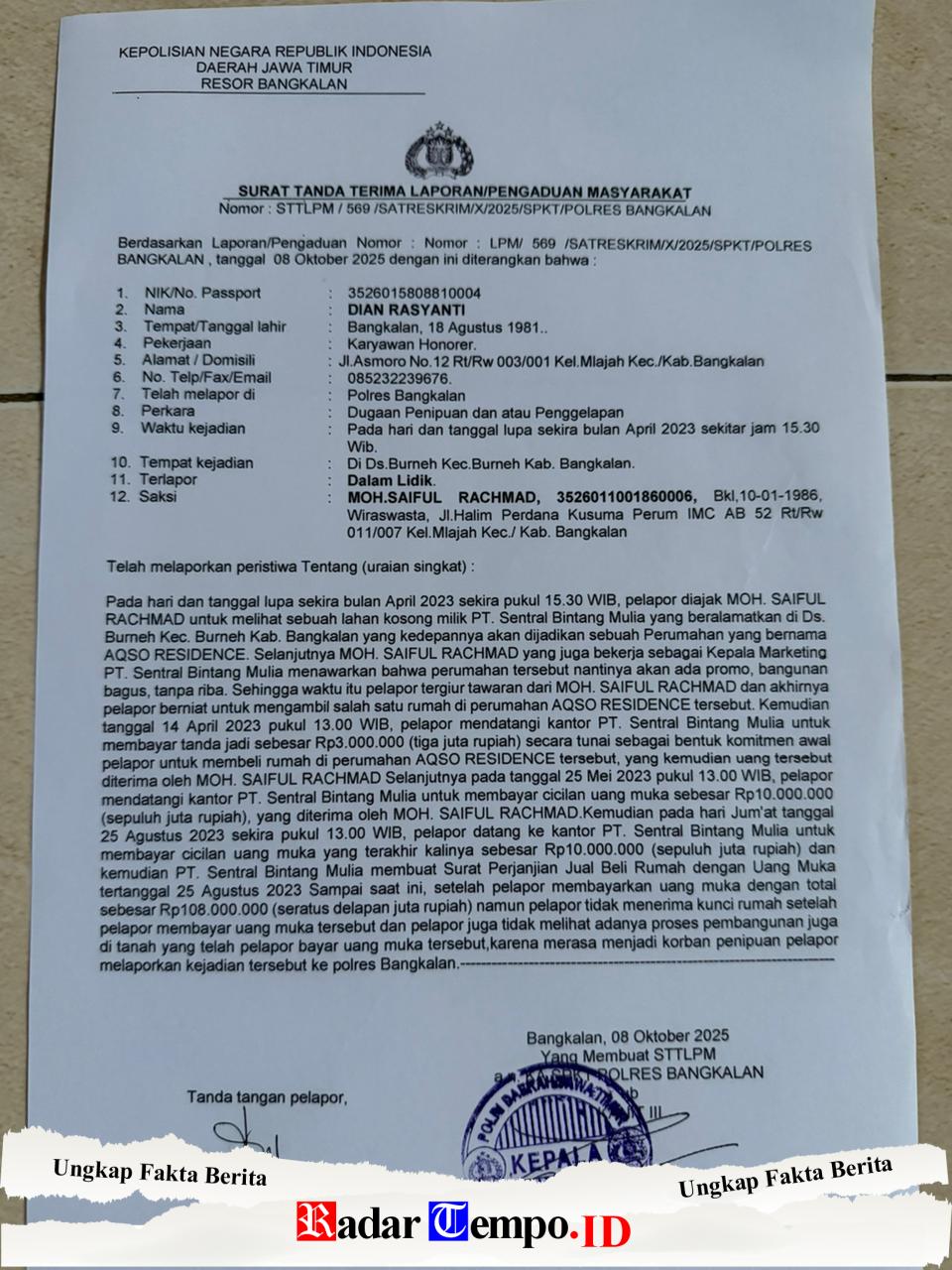 “Kami resmi melaporkan kasus dugaan penipuan dan penggelapan yang dilakukan pihak developer Perumahan Subsidi di Aqso Residence Bangkalan,” ujar Dian RasyantiS membuat laporan Ke, Mapolres Bangkalan.