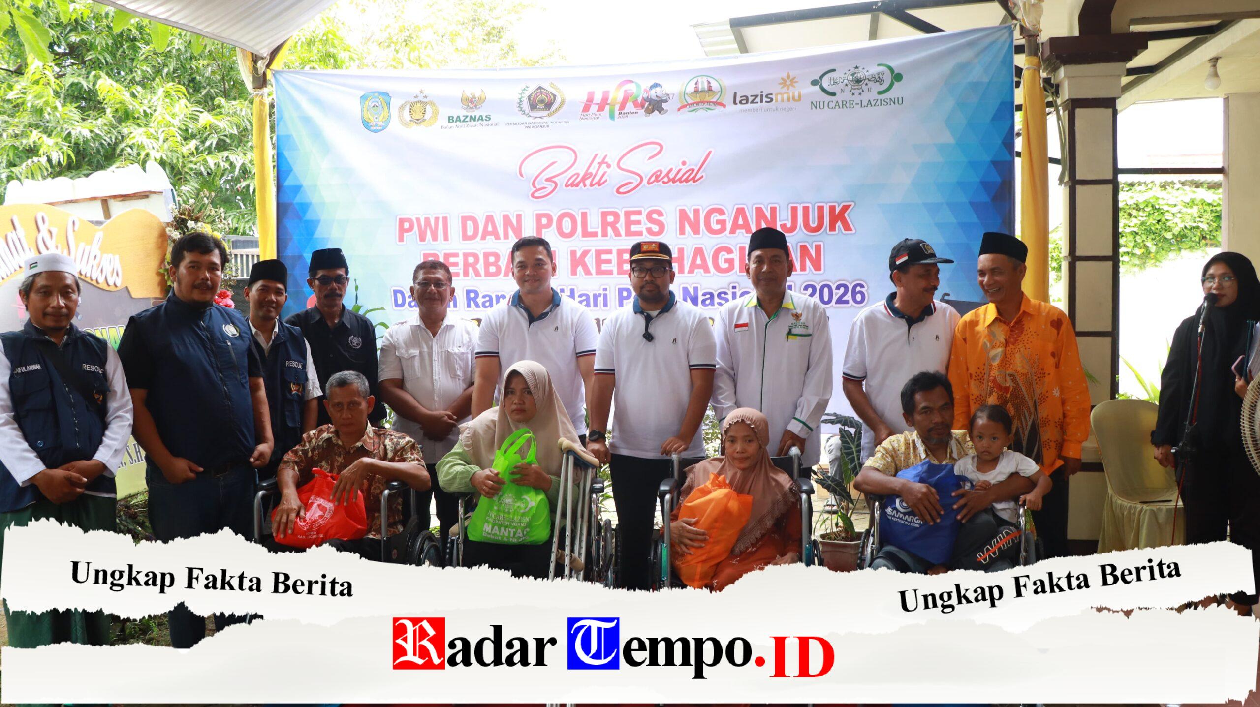 RADARTEMPO.ID Nganjuk – Kapolres Nganjuk AKBP Suria Miftah Irawan, S.H., S.I.K., M.I.K., bersama Ketua PWI Kabupaten Nganjuk Bagus Jatikusumo menyerahkan bantuan kursi roda kepada penyandang disabilitas serta membagikan paket sembako dalam kegiatan bakti sosial memperingati Hari Pers Nasional (HPN) 2026. Kegiatan tersebut digelar di Kantor Sekretariat PWI Kabupaten Nganjuk, Rabu (18/2/2026).